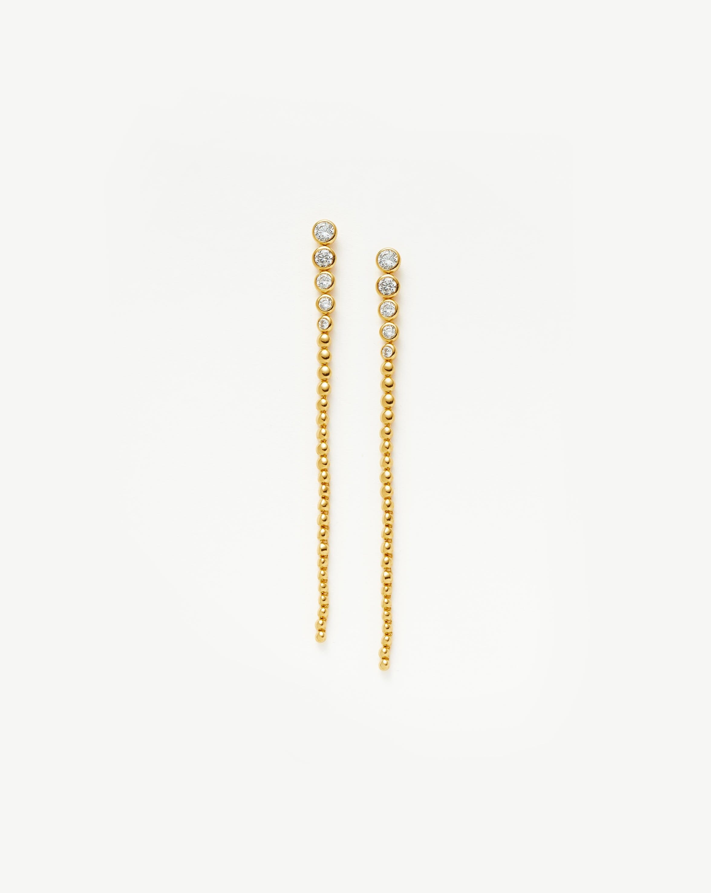 Our first-ever shoulder grazing earrings, these extra long drop studs feature rounded beads that graduate in size matched with cubic zirconia stones. Let them take centre stage as they move and flow in your ear stack, or team with pavé studs.