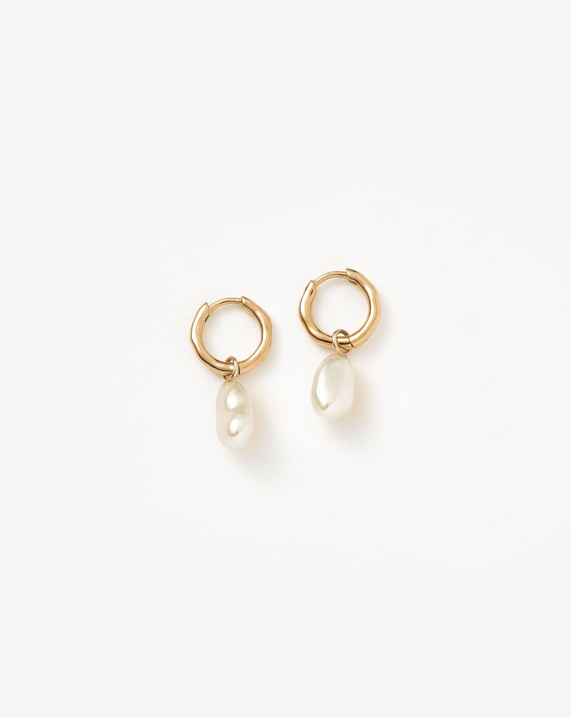 Organic pearl earrings paired with sculptural fine mini hoops, featuring a hidden hinge for a seamless closure. Two earring styles in one — remove the charm to wear the mini hoops on their own. Handcrafted from 100% certified recycled solid gold, and hallmarked for authenticity. .