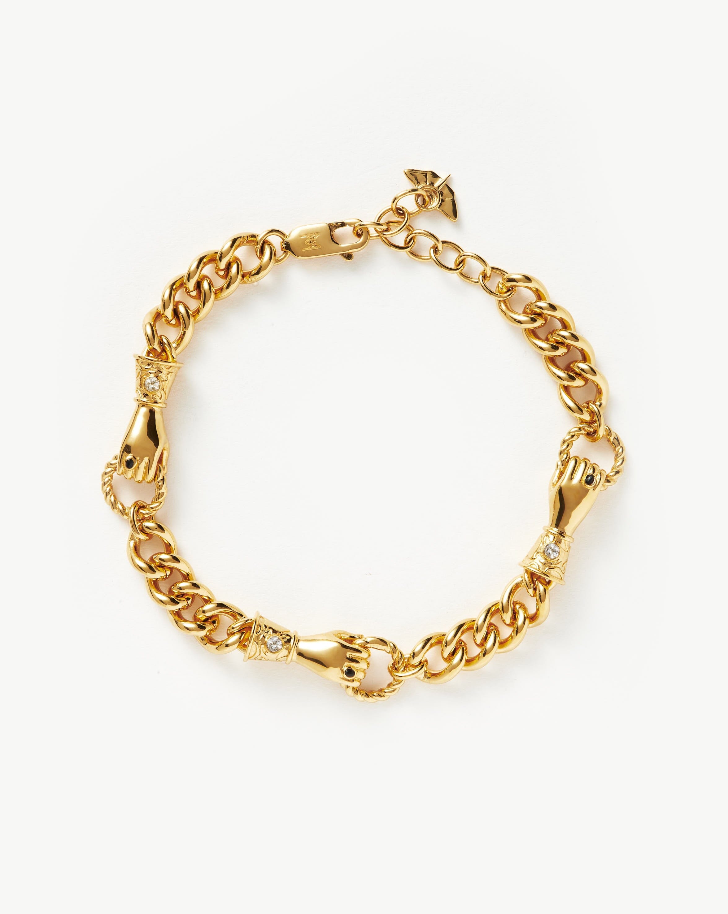 The Harris Reed x Missoma’s sell out ‘In Good Hands’ design is reimagined. This charm bracelet features the Georgian-inspired emblem on repeat, set on a chunky curb chain. Intricately detailed, each cuff has been illuminated with a white pearl cabochon and features a ring with a black onyx semi-precious stone. Stack with other chains and beaded bracelets or wear solo for everyday styling.