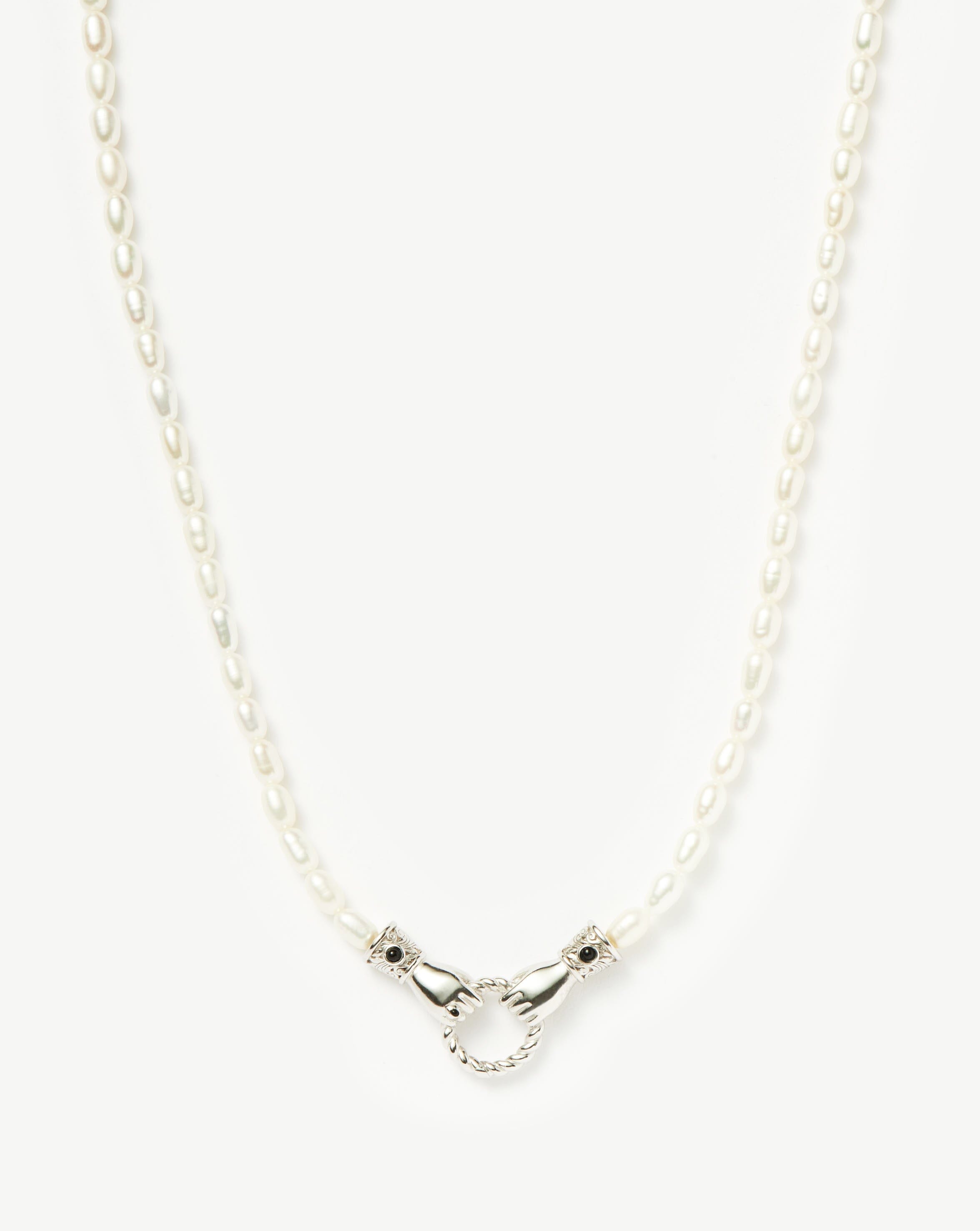 Two Georgian-inspired hands come together in this pendant, each holding a twisted ring. Intricately detailed, each cuff has been illuminated with white pearl cabochons and features a ring with a black onyx gemstone. The seed pearl necklace is finished with the collection's bespoke butterfly end charm, a symbol of duality. Pair with the In Good Hands Pearl Bracelet.