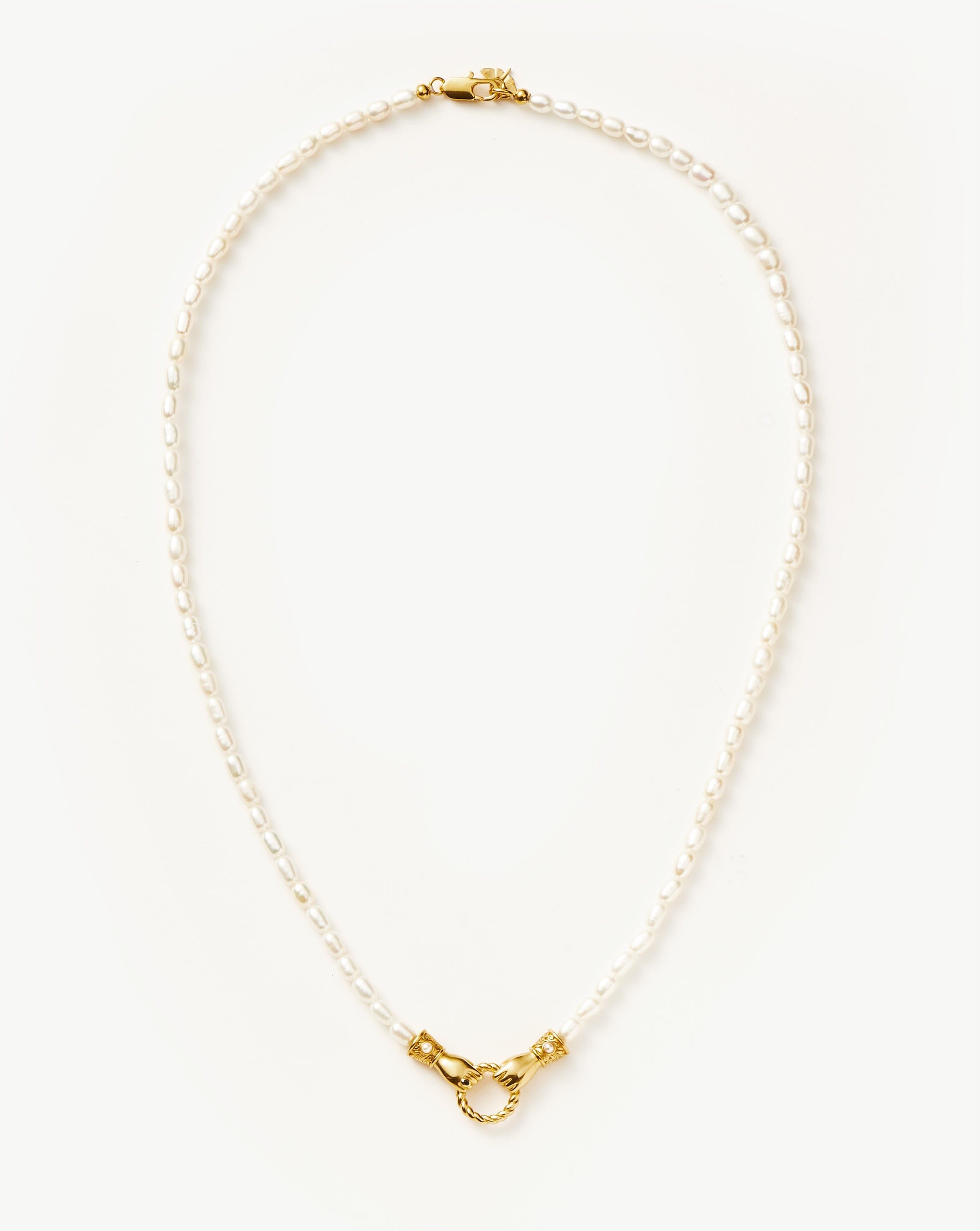 An Icon made longer. Two Georgian-inspired hands come together in this pendant, each holding a twisted ring. Intricately detailed, each cuff has been illuminated with white pearl cabochons and features a ring with a black onyx gemstone. The seed pearl necklace is finished with the collection's bespoke butterfly end charm, a symbol of duality.
