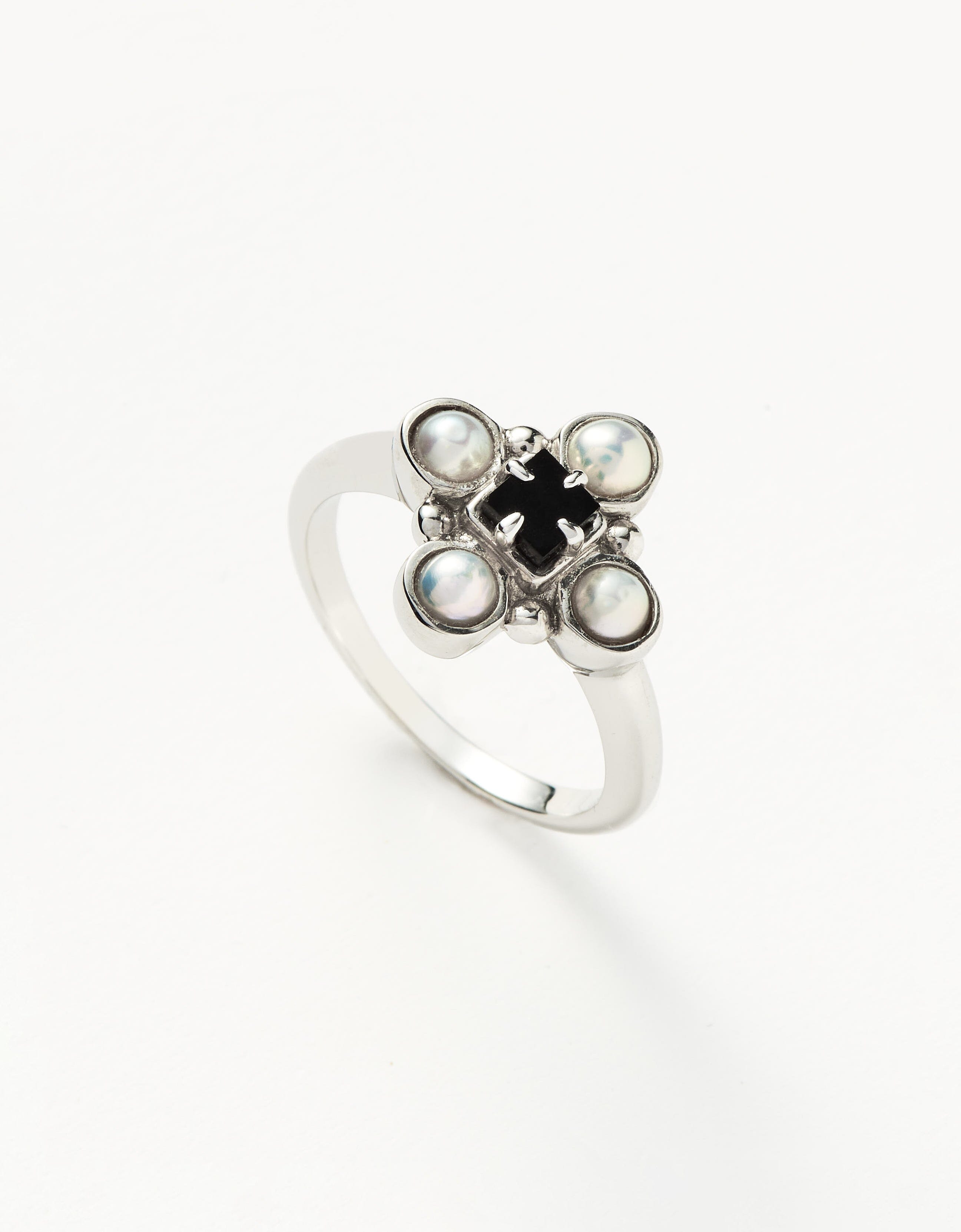 Inspired by the old world, this flower-shaped ring features a central square prong set black onyx stone surrounded by four luminiscent white pearl cabochons. The contrasting gemstones lend a touch of opulence to the plain delicate band.