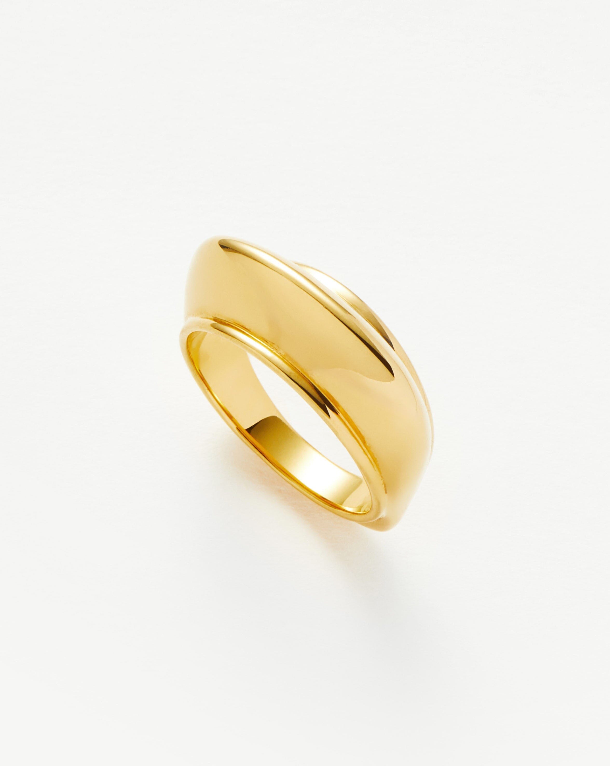 This statement stacking ring features a wide domed shape and a pyramid-inspired profile. Smooth textures and soft curves combine to create a high shine finish. Purposefully designed to be stacked with the Hera Dome Stacking Ring in silver for a mixed metals ring stack.