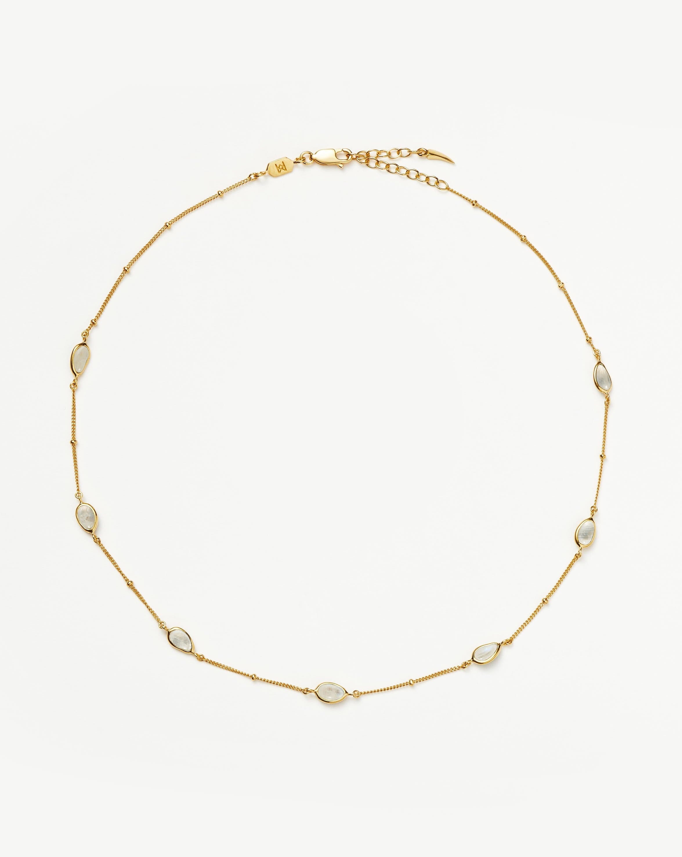 A symbol of new beginnings, rainbow moonstone meets molten in this delicate gemstone charm choker necklace. Team with other chains or beaded necklaces for more maximalist styling. Also available as a bracelet.