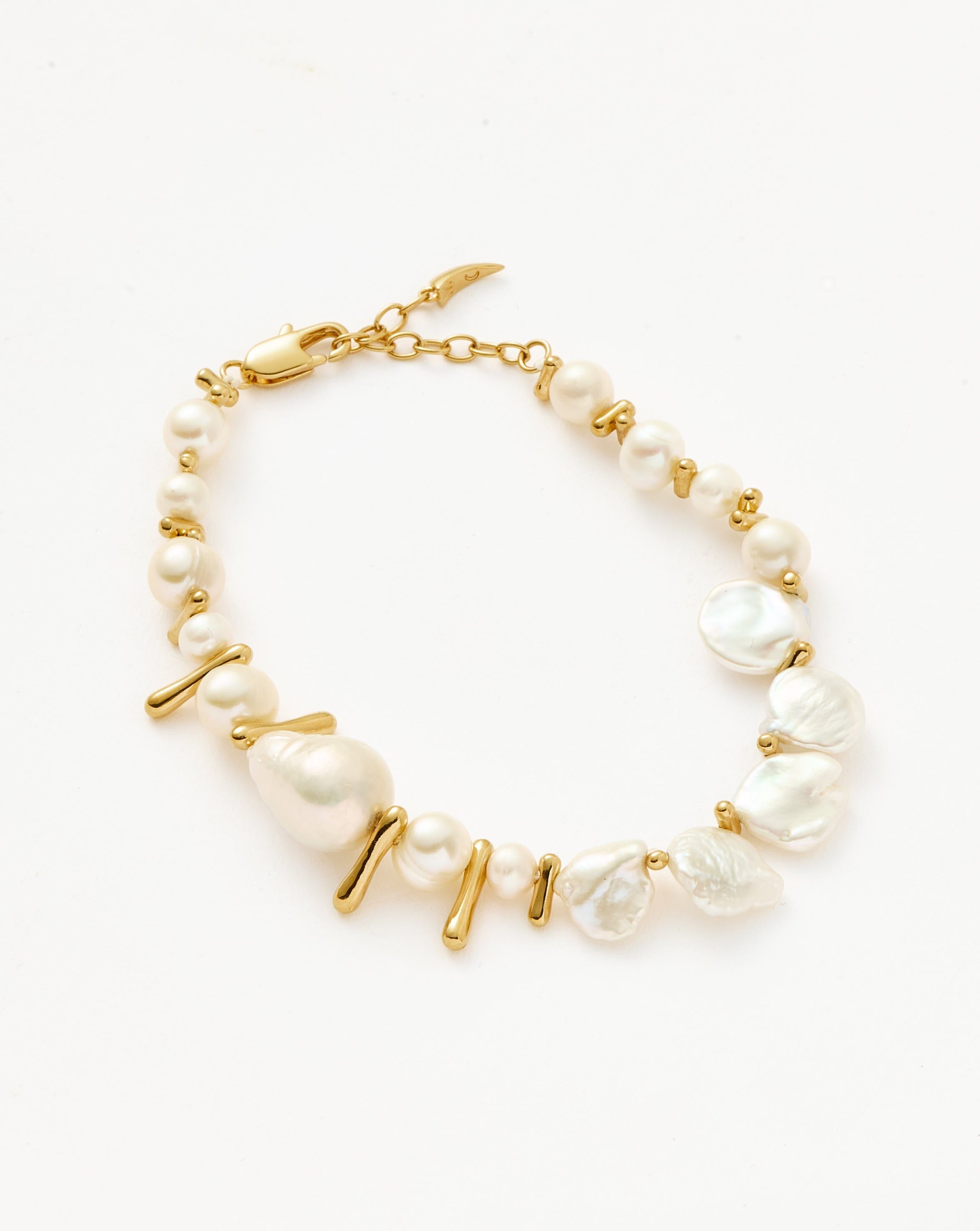 Pearls, reimagined. This statement pearl bracelet features three types of pearls with potato, Keshi and baroque beads offset with organic-inspired gold detailing. Let it take centre stage or create an arm stack with simple gold chains.