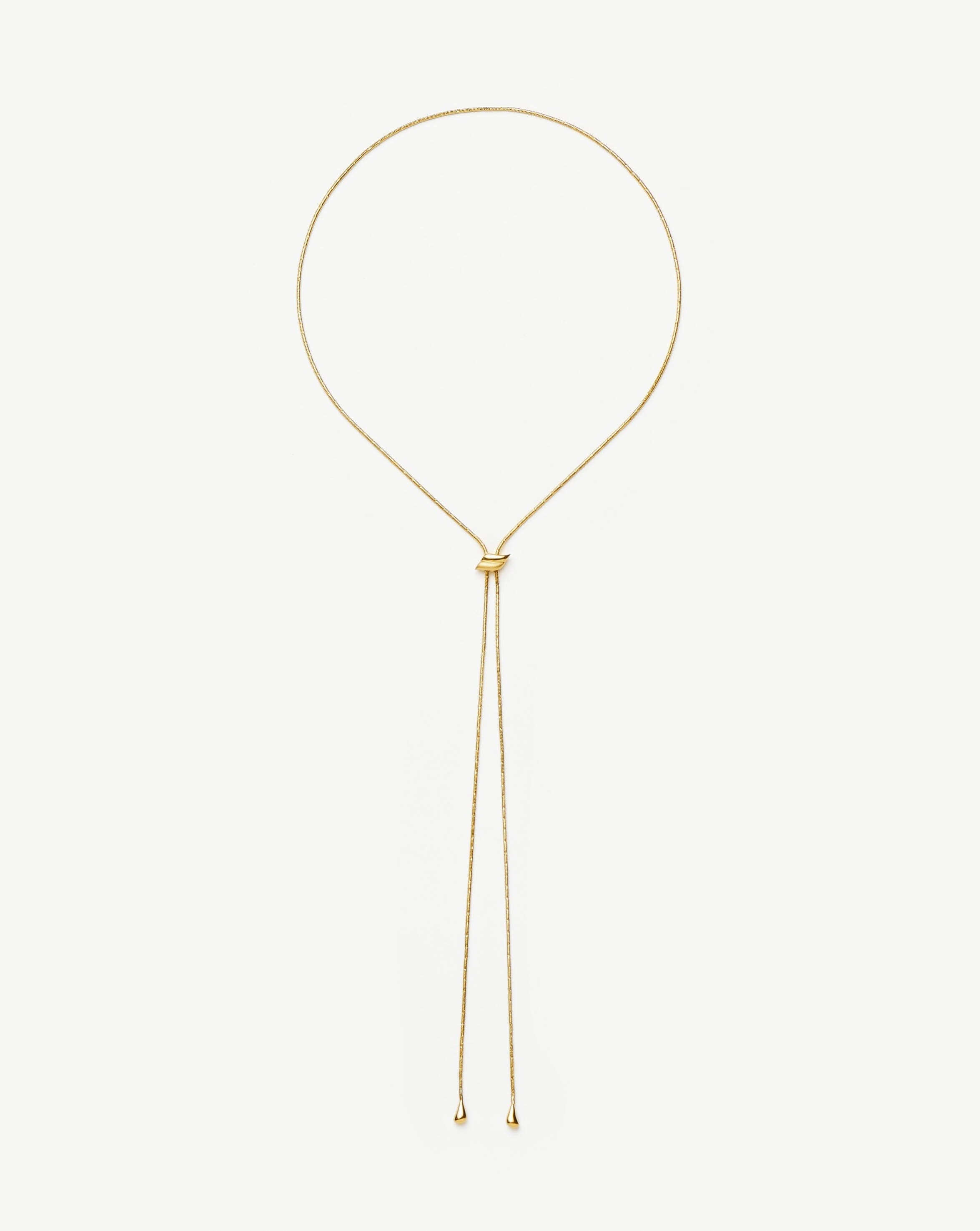 This statement lariat necklace features two droplet pendants with a matte and high shine finish, as well as an adjustable signature Savi 'S' slider for added versatility. Wear your way as a choker or as a medium necklace.