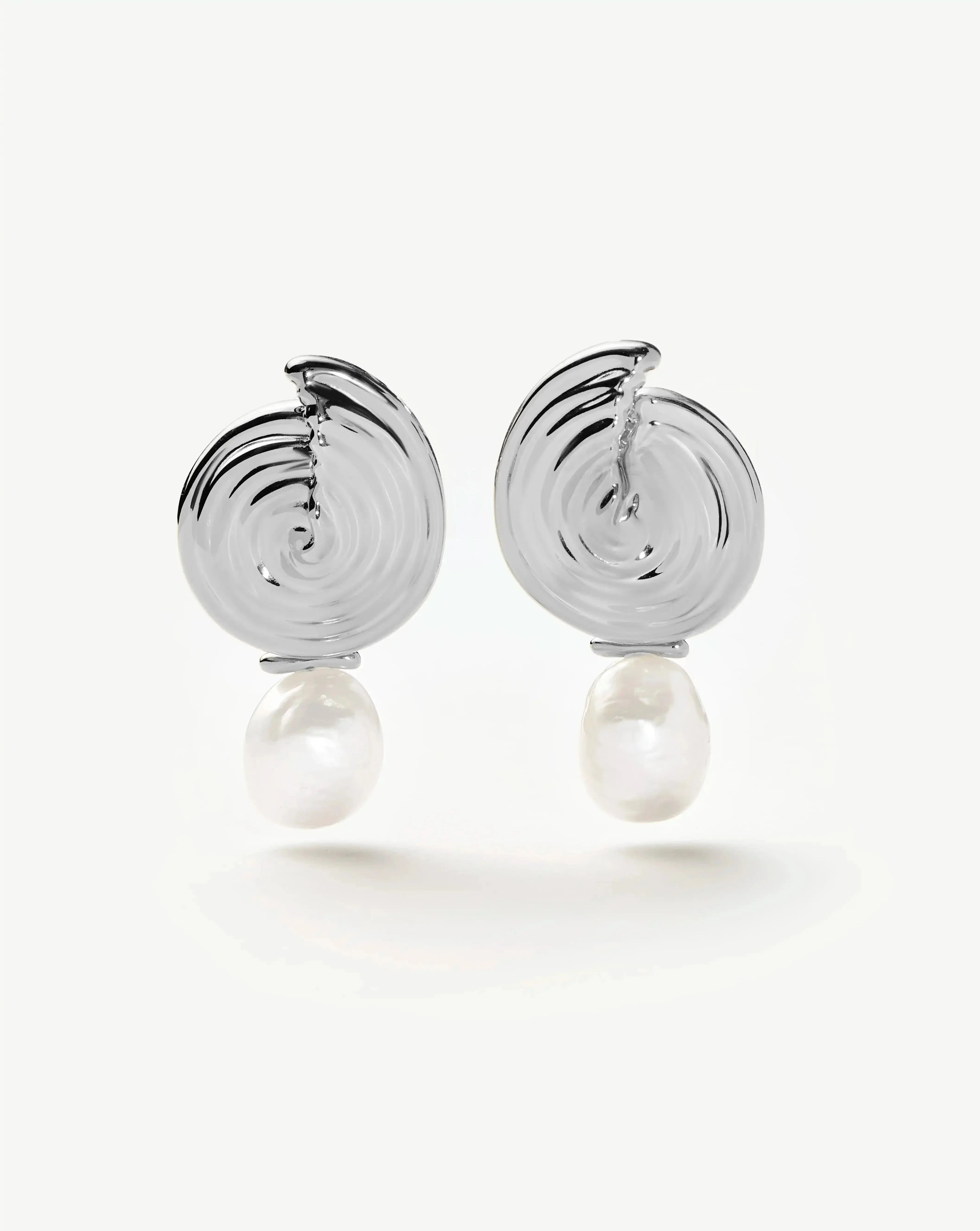 To pearl or not to pearl. These statement drop earrings feature a large silver spiral stud with a removable pearl attachment, making them a versatile addition to your jewelry collection. The pearl can be removed to wear as statement studs or mismatched earrings.