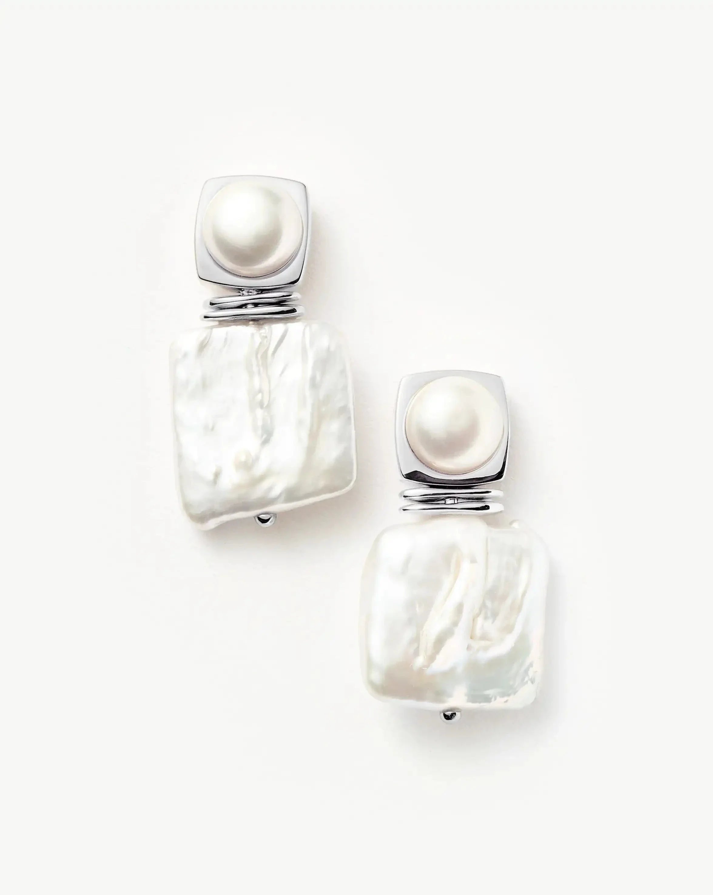 Pearls, reimagined. Make a statement with these large standout silver pearl drop studs, featuring large button and square pearls. Let them take centre stage or style with studs for an instant ear stack.