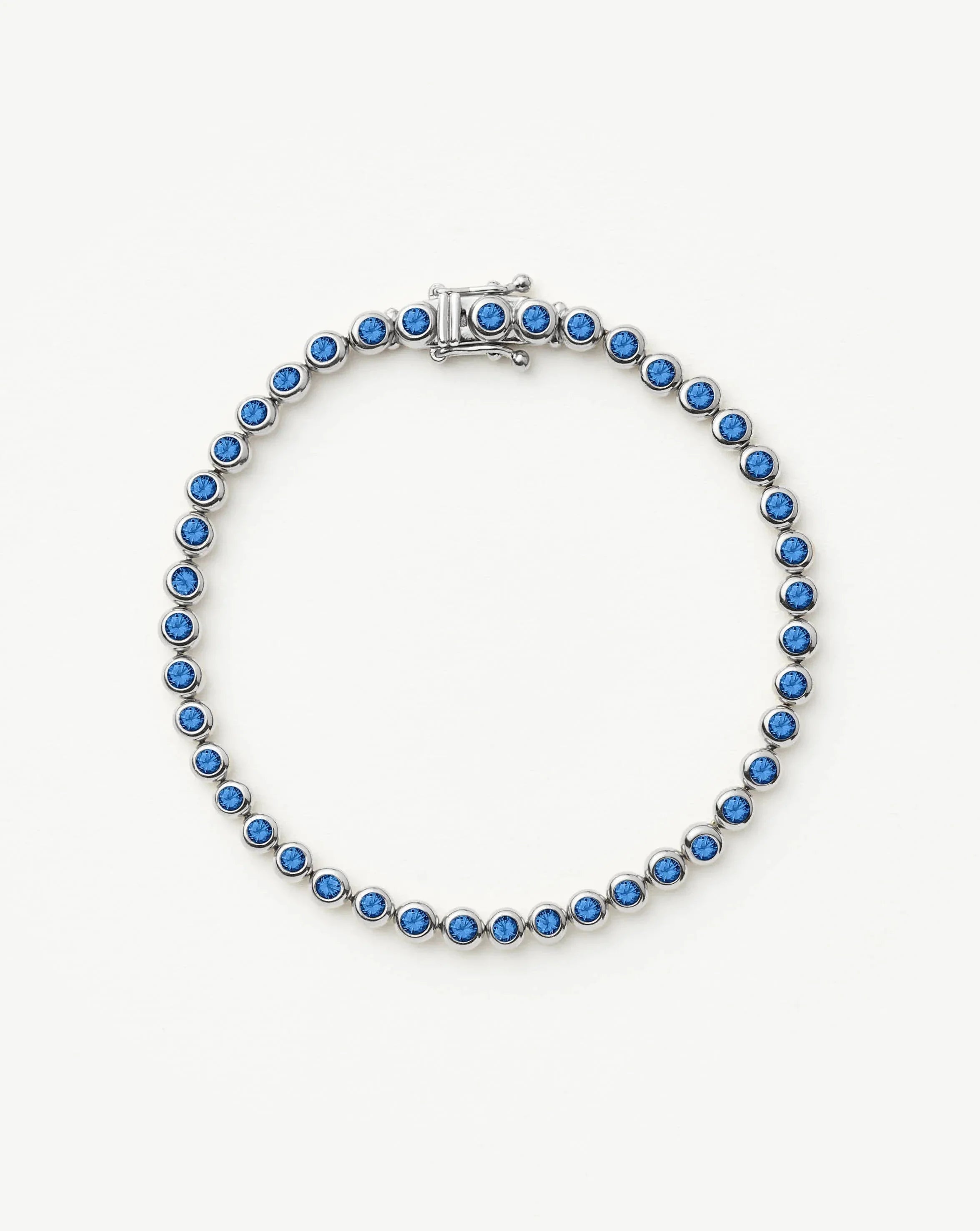 The classic you love, updated with a colourful twist. This luxurious bracelet features beaded detailing and is embellished with rounded faceted sapphire blue nano-crystals, perfect for September birthdays. The classic box clasp has both a double-ridged push-button closure and a lever closure for added security. Let it shine solo or team with chunky chains for an instant arm stack.