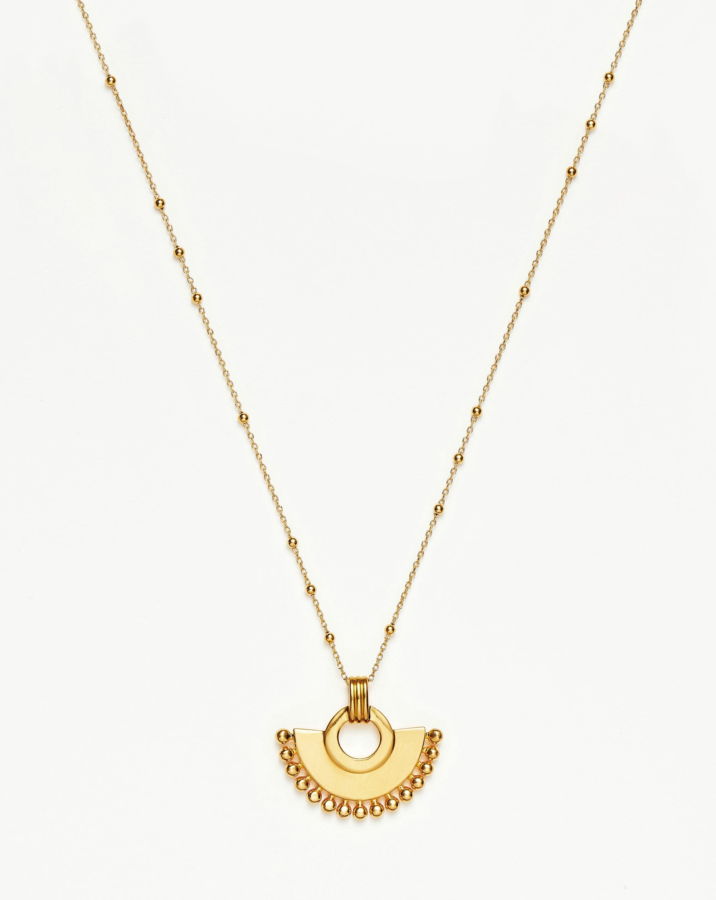 A distinctive addition to your layers. Inspired by Colombian artistry, this necklace features bobble-trimmed charms suspended from a unique fan-shaped pendant. A standout style you can easily wear day to night, create contrast by teaming with a gemstone choker.