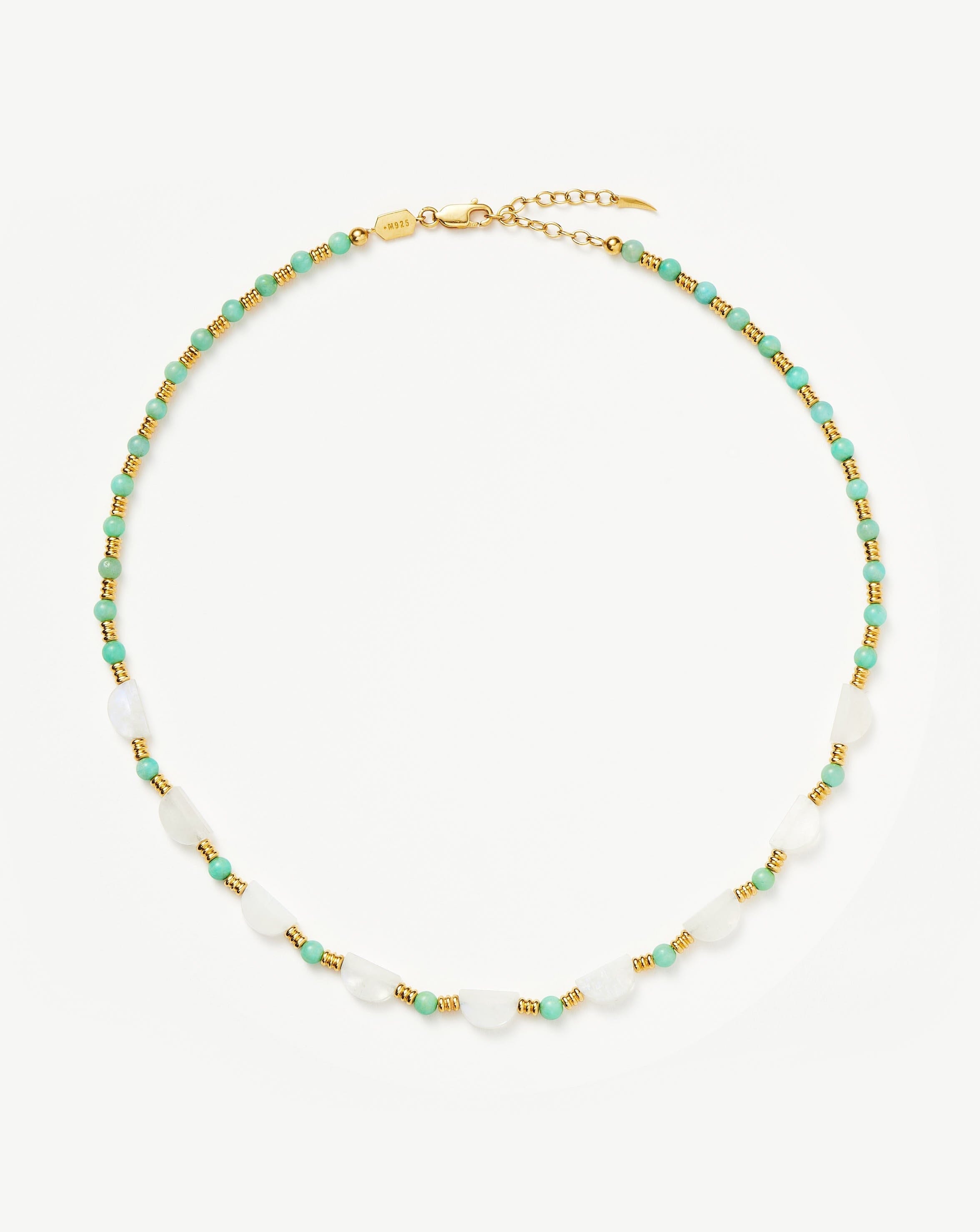Inspired by our original best selling Zenyu collection. This everyday choker features hand-cut rainbow moonstone half moon shaped charms and round amazonite gemstone beads — known for new beginnings and healing — offset by ridged gold beads for a striking contrast. Layer with more beaded necklaces or pair with a Zenyu Gemstone Beaded Bracelet.
